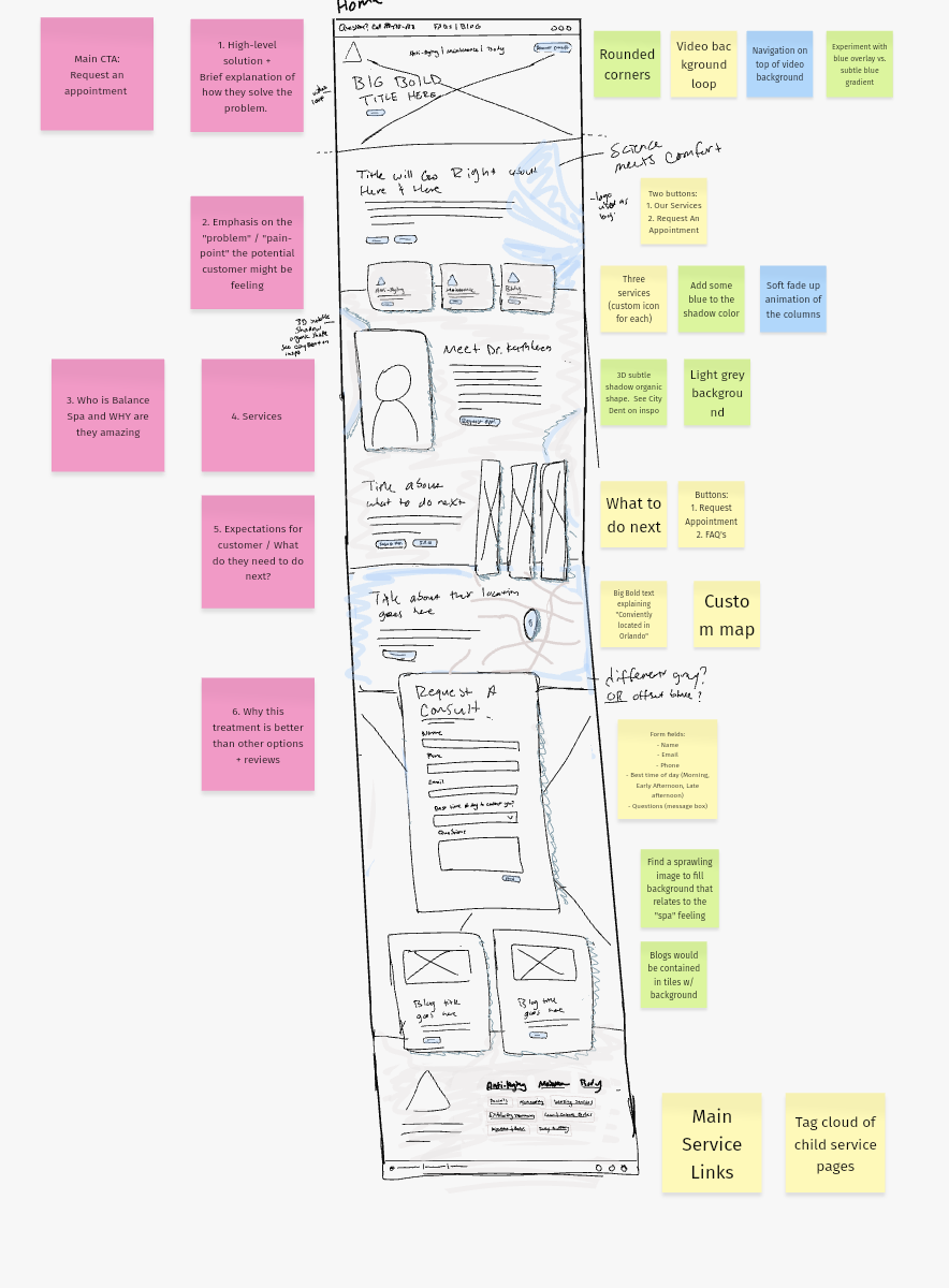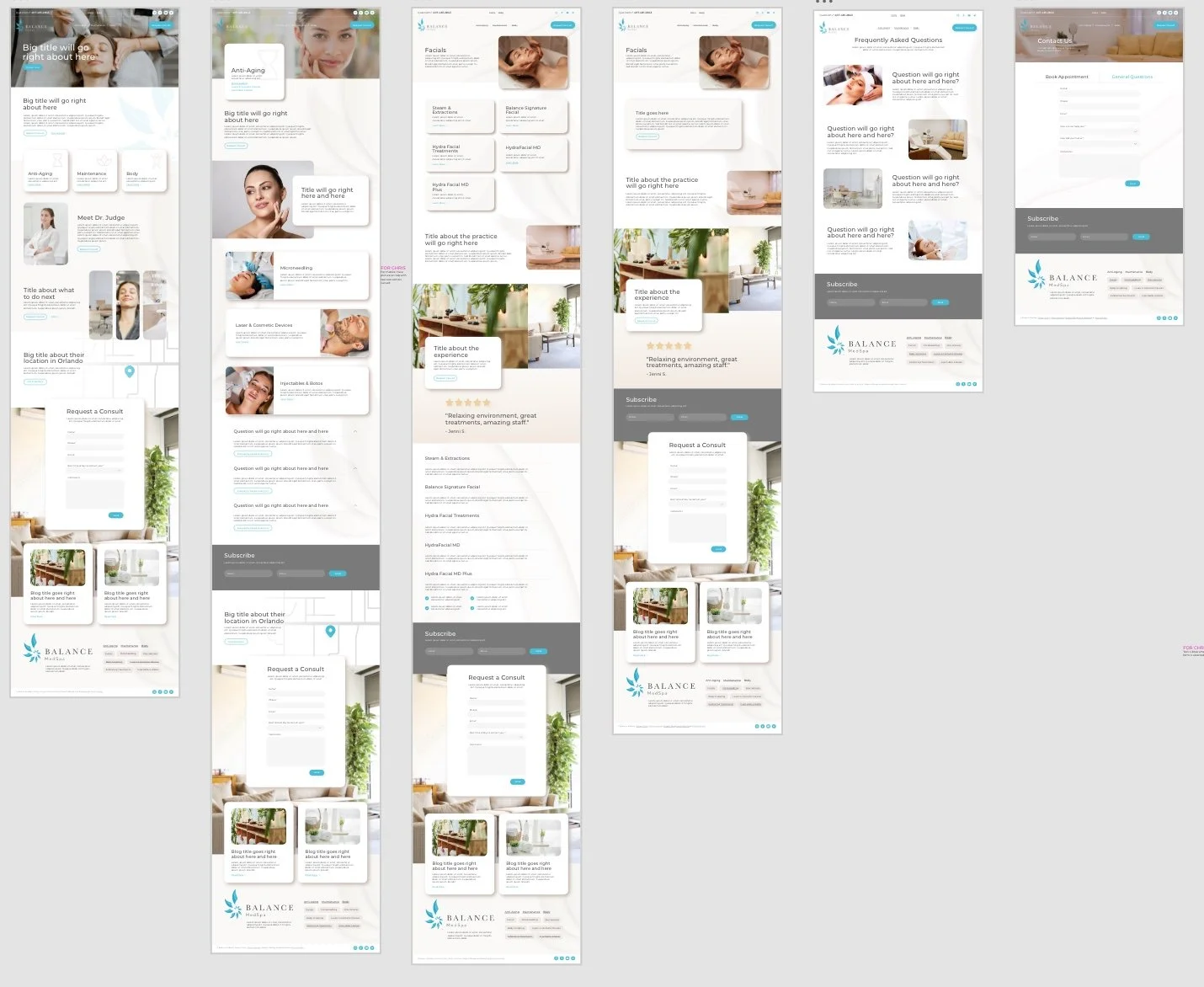 The wireframe helps to give a visual direction and overall flow to be able to see how the site will be laid out and interconnect. This ensures that I’m taking the user on the correct journey and the information is being presented to the user in a way that will achieve the end goal. In this case the story is to give the user an overview of who Balance MedSpa is, what services they provide, what the environment of the offices is like, followed by a description of the owner and Doctor on staff, some FAQ’s to answer any lingering questions, where they are located, ending on a CTA to request a consult.