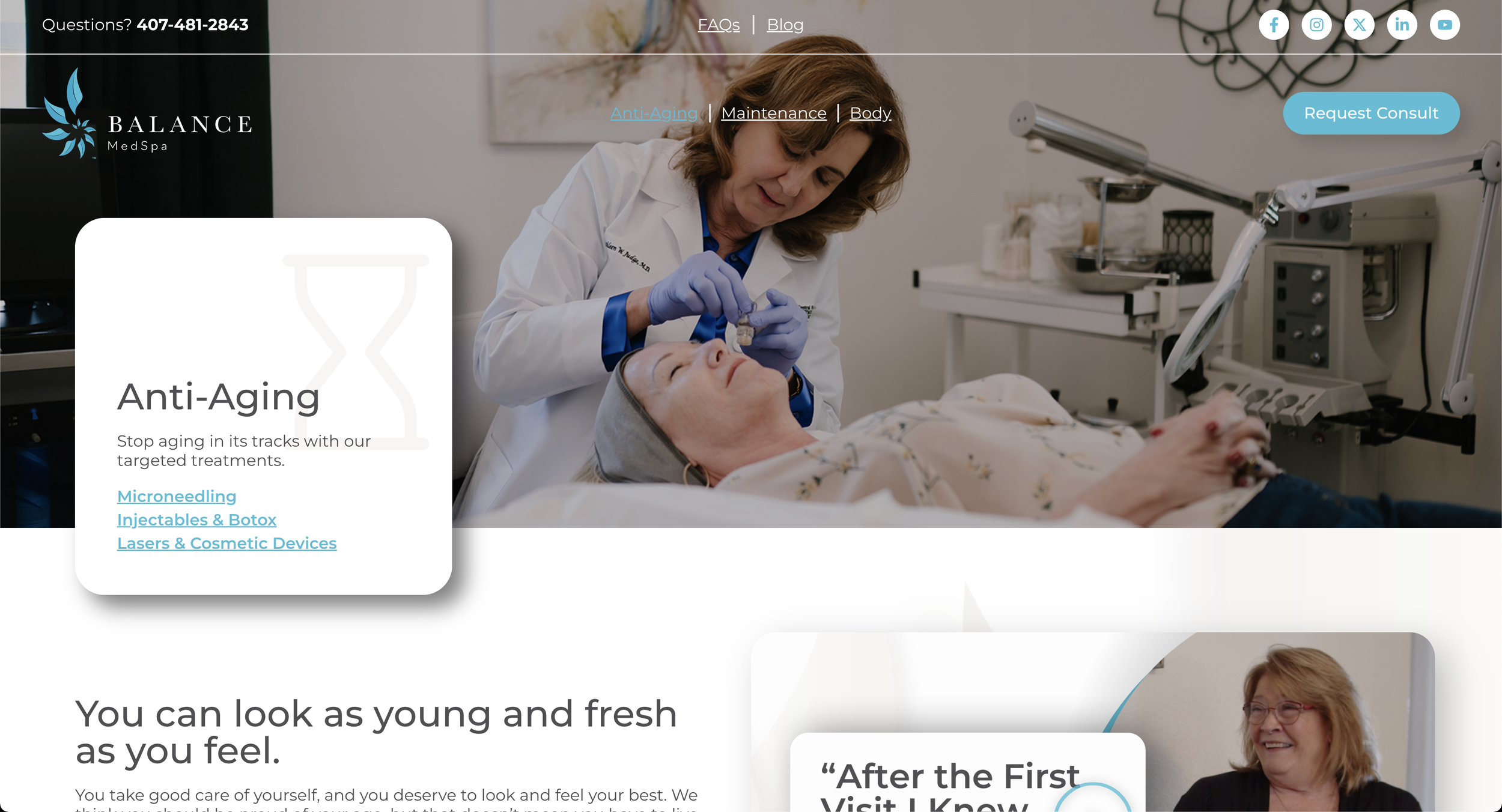 Balance MedSpa is a luxury medical spa for skin care that helps clients look younger and improve self confidence in how they look. The tone we kept to was - Professional, Conversational, Warm, Helpful, and Insightful. The goal was to create a site that felt as high end and tranquil as the business itself. Because it was a MedSpa, we wanted the user to feel like they would not only have a serene experience, but that the site could fit into the medical field, giving the user a reassurance that they will get a medical grade spa experience.