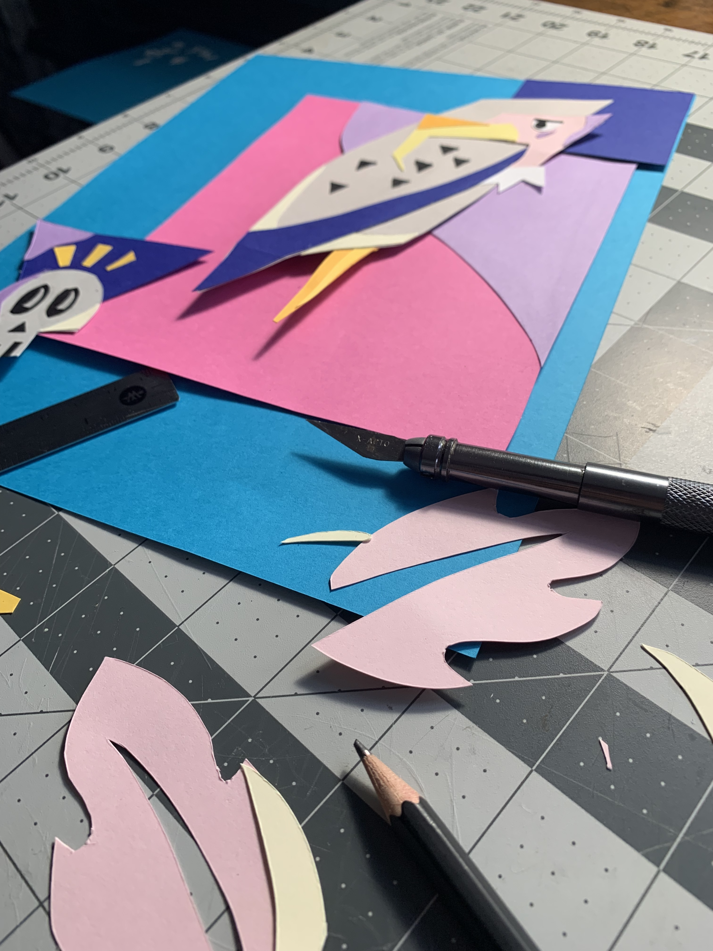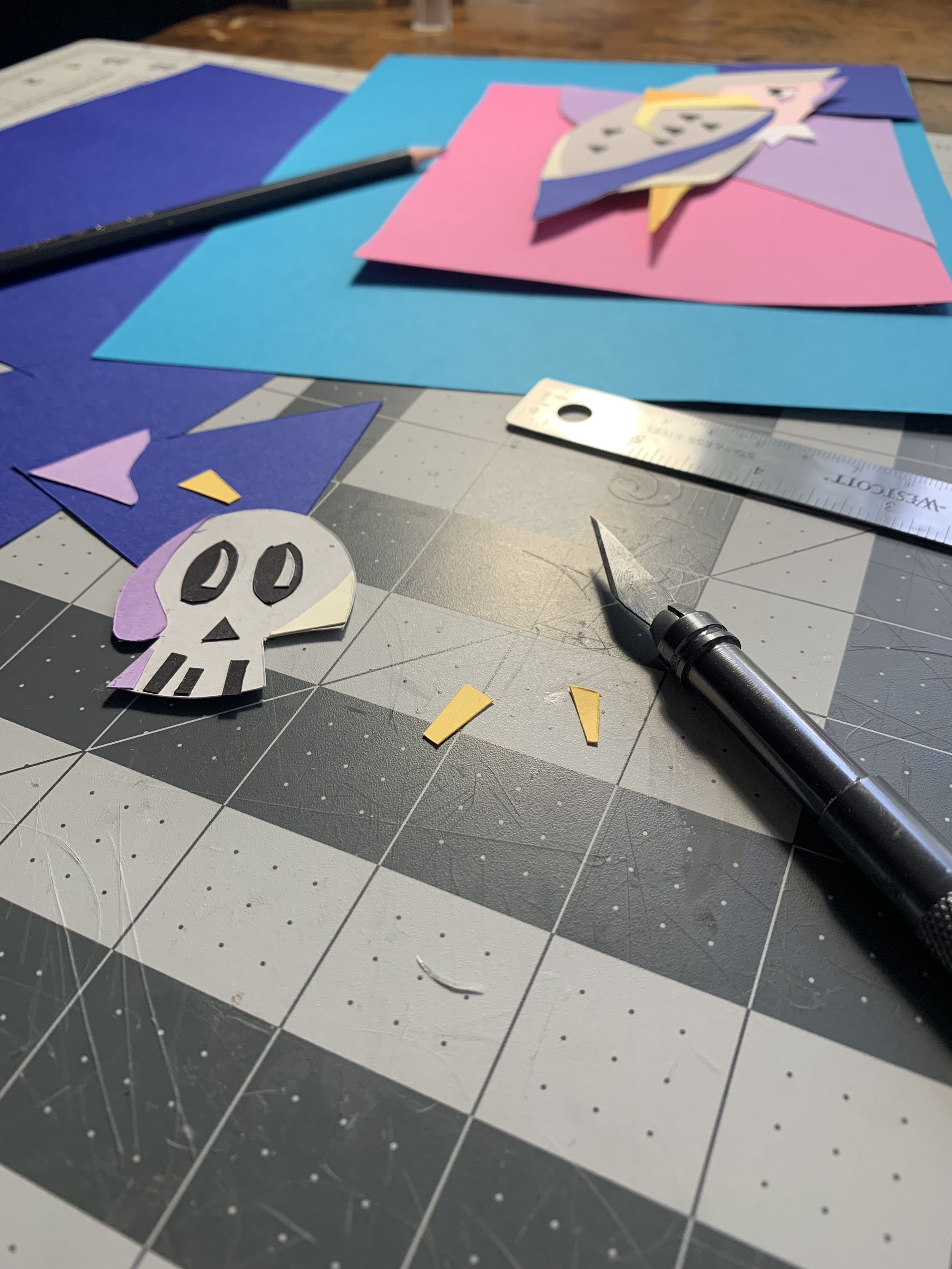 I then go onto vectoring the piece out in illustrator. This helps me visually see what the finished thing is going to look like so I know what I need to change before I spend too much time cutting it all out. It also helps me see colors and what colors work together.