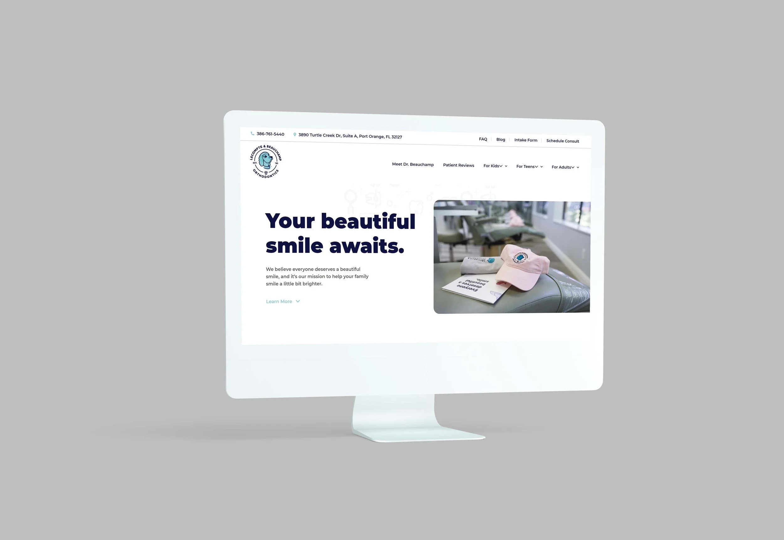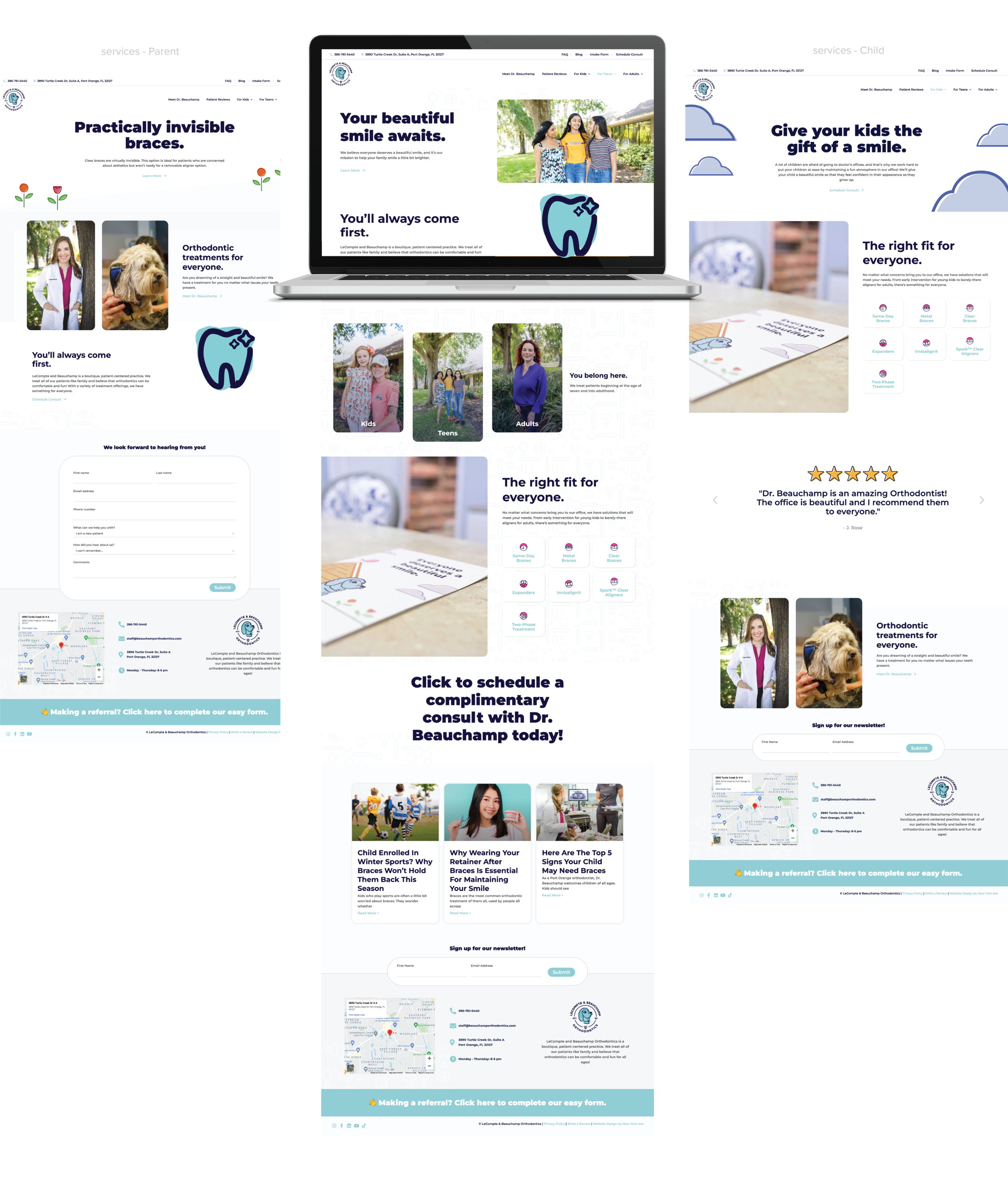 Below is the website design I created for LeCompte and Beauchamp Orthodontics. To maintain brand consistency and establish a clear brand voice, I infused as much personality from the logo into the overall design as possible. The logo is fun, playful, and illustrative, so I carried those qualities into the website by incorporating bold, custom-designed icons that match the logo's style.